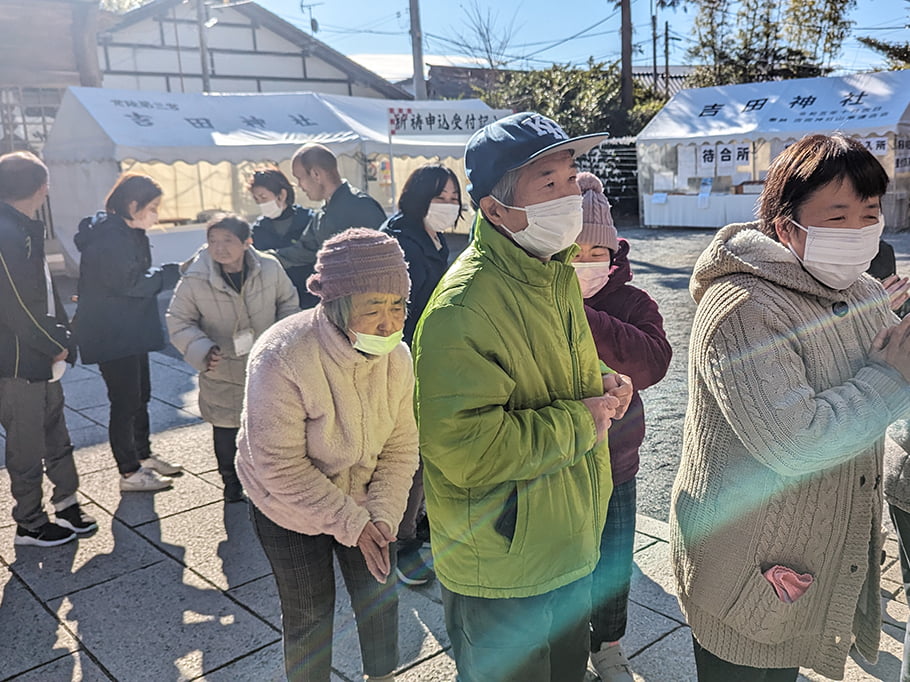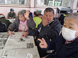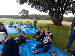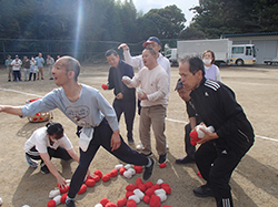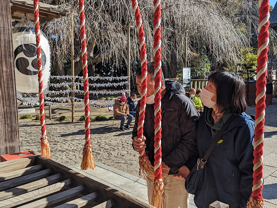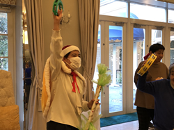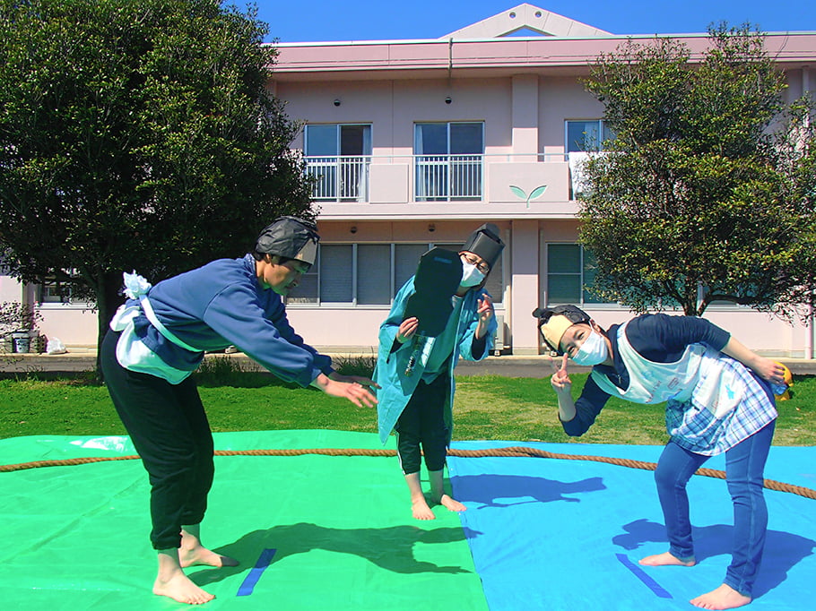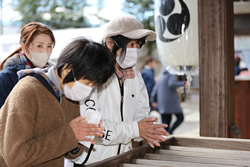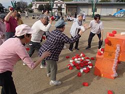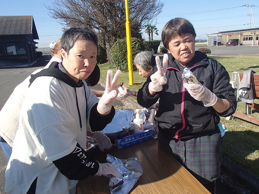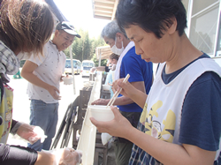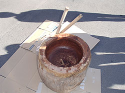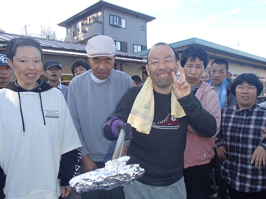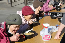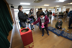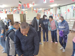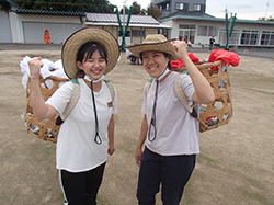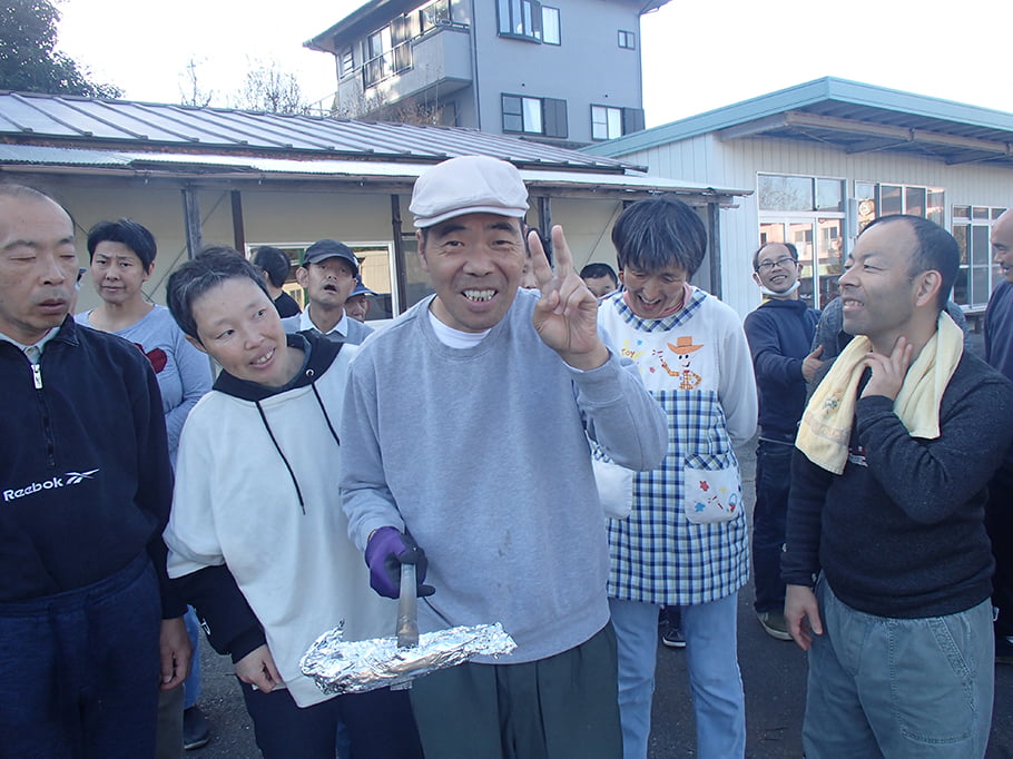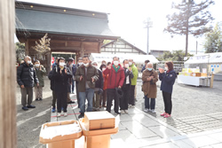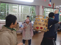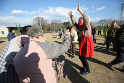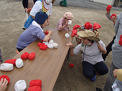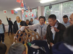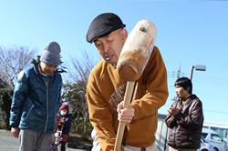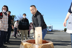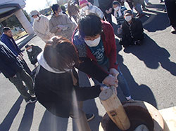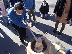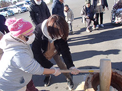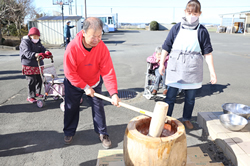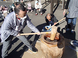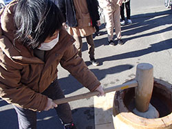 | 青空の中、「ヨイショ」「ヨイショ」と掛け声掛けてのお餅つき。お正月の鏡餅作りをしました。 | ||